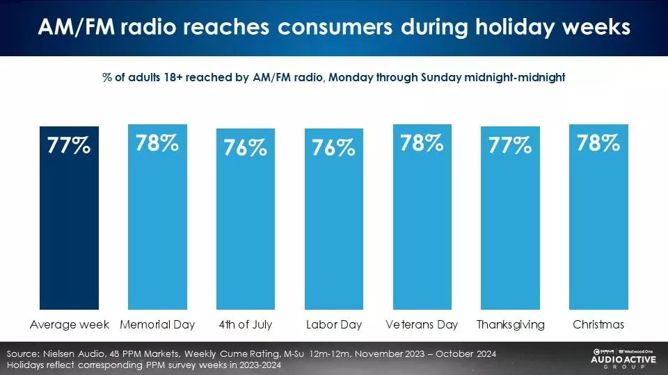 AM/FM radio reaches 77% of adults 18+ during Thanksgiving week and 78% during Christmas week, according to Nielsen data, maintaining consistent reach throughout the holiday season