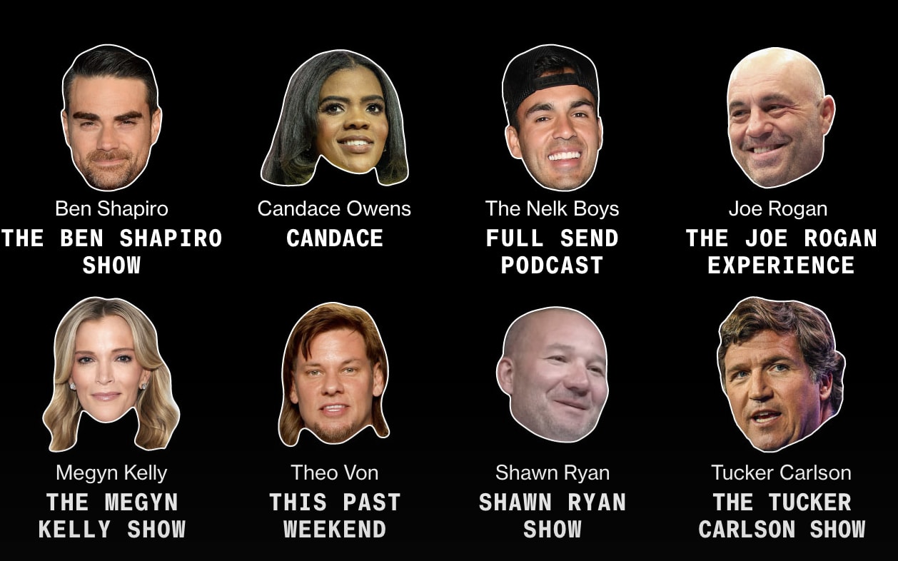 The investigation examined eight popular conservative podcastersâJoe Rogan, Ben Shapiro, Candace Owens, Tucker Carlson, Megyn Kelly, the Nelk Boys, Shawn Ryan, and Theo Vonâwho collectively command more than 3 million YouTube subscribers each and advocated for President Trump around his 2025 inauguration. Bloomberg identified 188 unique advertisers, finding that 27% relied on explicit political ideology in their marketing, while 23% employed anti-establishment rhetoric and 22% promoted alternative health products.