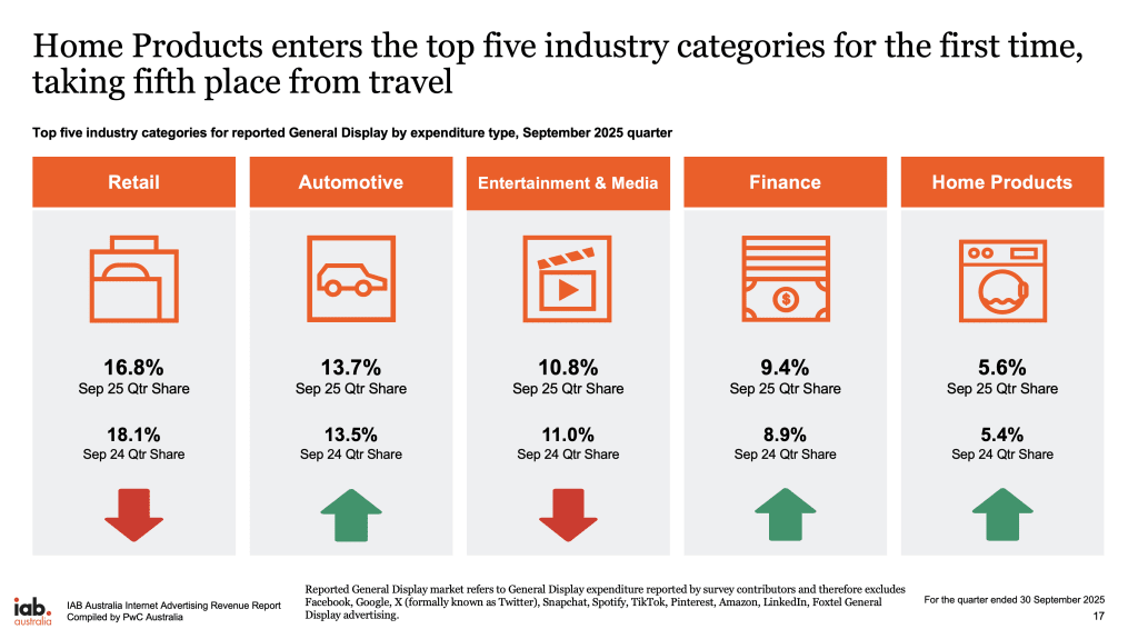 Entertainment and media ranked as the fourth-largest advertiser category at 10.8% share, behind retail (16.8%), automotive (13.7%), and home products (5.6%)