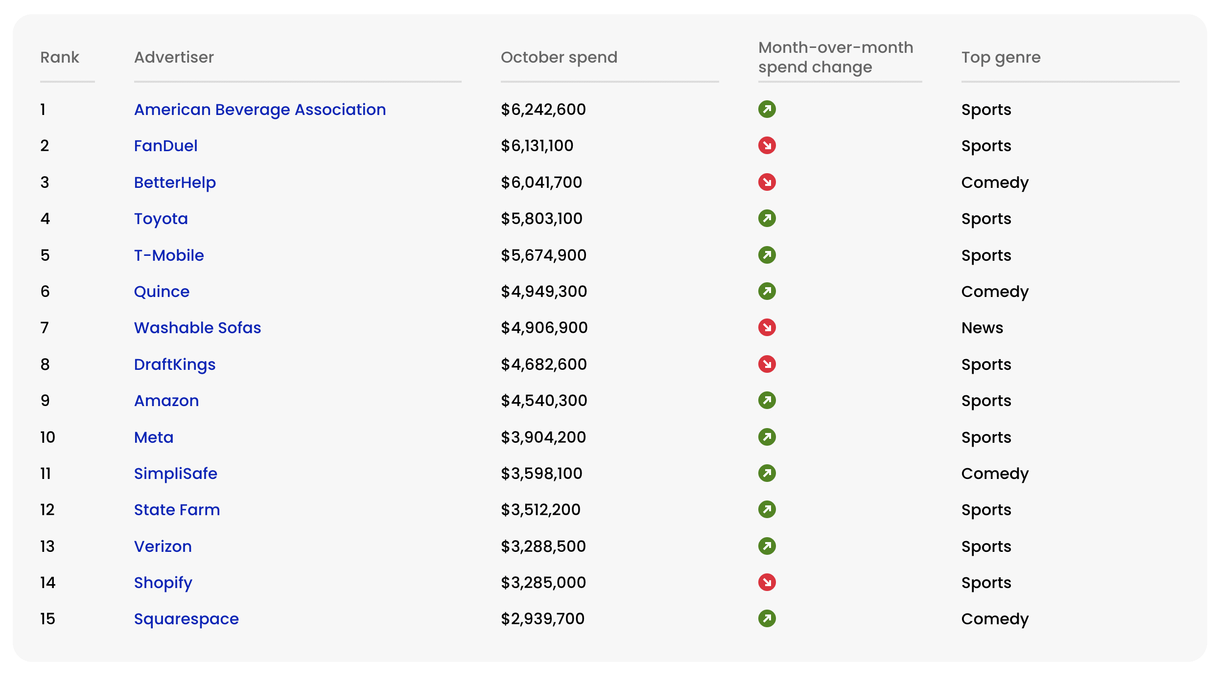 Why It Matters: The October rankings reveal how quickly advertiser priorities can shift in podcast advertising, with the American Beverage Associationâs 599% spending increase demonstrating that major campaigns can dramatically alter the competitive landscape within a single month. For podcast producers and networks, understanding that sports content commanded six of the top 10 advertiser budgets provides clear strategic direction about where premium advertising dollars are flowing. The data also exposes how concentrated podcast advertising remainsâ15 advertisers accounting for approximately $66.5 million in a single month while the broader market struggles to capture mid-tier advertising commitments.